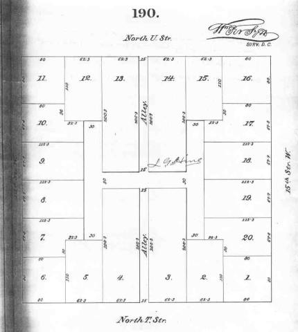 The squares, triangles, and reservations thus created were numbered. Square 190, bounded by 15th, 16th, T and U Streets, NW, is part of this original layout. Caroline Street as a roadway, however, was not part of that initial plan.