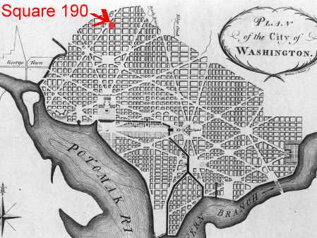 According to the Records of the Columbia Historical Society, the land on which square 190 and much of the surrounding area were eventually developed was once known as Flint's Discovery. Flint's Discovery was a land grant made on December 20, 1722, to one John Flint from one of the Lords Baltimore, the original proprietors of the Maryland colony.[6] By the time the District of Columbia was established in 1791, the northern tip of the city including Square 190 and a crescent down the west side including today's Kalorama and what we today consider Foggy Bottom was owned by Robert Peter. Under the terms of the agreement for the city, owners would deed the land for the streets and some of the squares to the Federal government, to be compensated by keeping part of the land for development. Robert Peter deeded what became Square 190 to the government. He kept for development scattered squares including 176 immediately west of 190.[7]