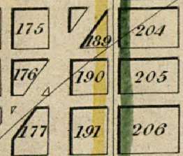 At some point plats (subdivision maps) of the squares were drawn. Below is an early proposal for a layout for Square 190. The lots were much larger than today's are, with all fronting on one (or at the corners two) of the main streets around the square. An alley system would provide rear access to all lots except those on the outside corners. (Square 205 to the immediate east of 190 was actually developed according to this plan.)