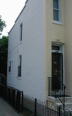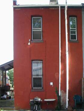The rears originally had two windows upstairs, a window or a door downstairs, and a small window for the basement. There was certainly a gutter and downspout, and as the houses were built with city water supply there was likely also the exterior soil stack (vertical drain from toilets and sinks) still visible on some of the houses today. The houses at the east end of the street, which were apparently built first, have side entrances to the kitchen. Some houses on the western (later) part have rear doors to the kitchen. A few houses on the western end of the block have an outside entrance to the basement, although in no case was the basement originally built with a high enough ceiling to be a living space.