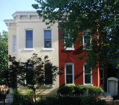 Even though they were built well into the Victorian era - known for its ornate architectural embellishments - the 12 pairs of semi-detached houses that Diller B. Groff built on Caroline Street are characterized by a simple design. His choice may have been a matter of economics, building something that could be quickly constructed and could be afforded by government clerks and others of modest means. Each house measures 16 feet wide and 41 feet deep on the exterior. In the center of the block on each side of the street, Groff placed two structures with flat fronts, each with two semi-detached residences. Then, on each side of these center units he built two additional structures, again with two semi-detached residences each. These units had indented corner entrances. This created a series of 24 individual residences, twelve semi-detached ones on each side of the street in six structures. Between each structure he left an approximately 9-foot-wide passage (4 1/2 feet for each residence) that provided access from the area of the street front to a small rear yard. This combination of flat and indented fronts, with a break between each semi-detached pair, and with a set of white marble steps accenting each residence, created a simple yet unifying architectural and spatial rhythm.
