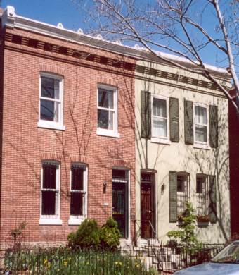 Flat front houses have brick corbelled cornices. The houses were built with unpainted brick, but all were painted at some later time. 1515 (on the left) has been returned to the original condition. Note the decorative tin pinnacles along the front roof edge, which can still be seen on a few other houses.