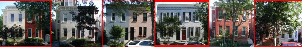 Indented-front houses have more elaborate bracket cornices. On all houses the front has three windows on the second floor, two windows and a door on the first floor, and a small basement window.