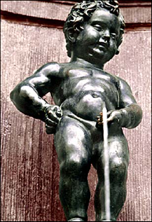 Post Script: The Women's Lib movement has even taken note of Manneken. Equality demands resulted in the installation of a female version, Jeanneken Pis. Most tourists don't ever see her, however. She is on a dead end alley (Impasse de la Fidélité) off Butcher Street (Rue des Bouchers).